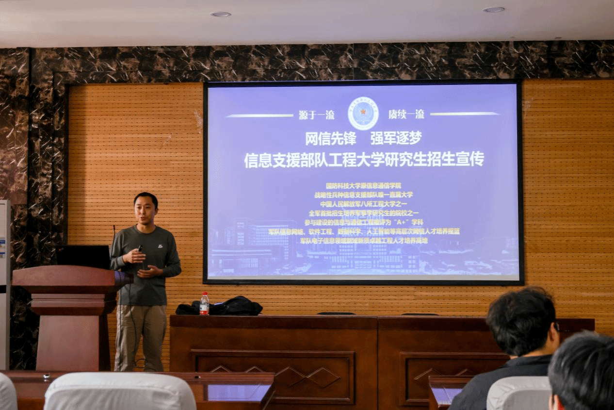 会议伊始,信息工程大学负责老师全面展示了信息工程大学作为新型作战力量人才培养高地的深厚底蕴。作为国防信息领域高端学府,学校拥有国家级重点实验室及各类尖端科研平台,在电子信息、计算机、网络通信等学科领域位居国内前列。詹老师结合国际形势,阐释了信息支援在现代国防中的重要作用,点明 “强军必先强信” 的战略意义。针对师生关注的招生政策,他逐一细致解读:学校无军籍研究生是吸纳地方优秀人才、服务国家战略的重要举措,今年投放无军籍博士招生指标,秋季入学,明年招生规模进一步扩大,预计招收博士、硕士若干名,专业聚焦电子信息、计算机、网络通信等前沿方向,着力培养破解 “卡脖子” 难题的高层次人才。随后,负责老师还介绍了学校办学的 “5 个优势” 与 “4 个好”,以实例彰显学校核心办学特色与综合实力。宣讲会现场座无虚席,精准覆盖大四本科生及研二、研三正处在升学抉择关键阶段的学子。在学生会有序组织保障下,会场秩序良好、氛围热烈。互动环节中,同学们围绕跨专业报考门槛、校内资源共享、毕业择业方向等问题积极提问。詹老师回应指出,无军籍研究生既可参与军队科研协作,在军工集团、科研院所等岗位也具备强劲竞争力。